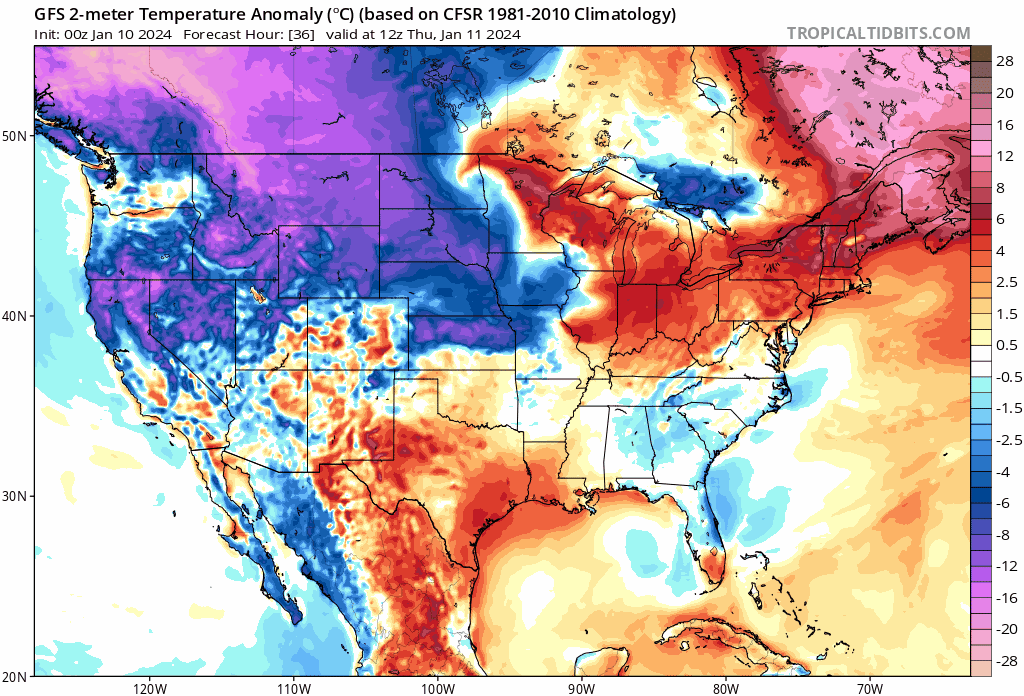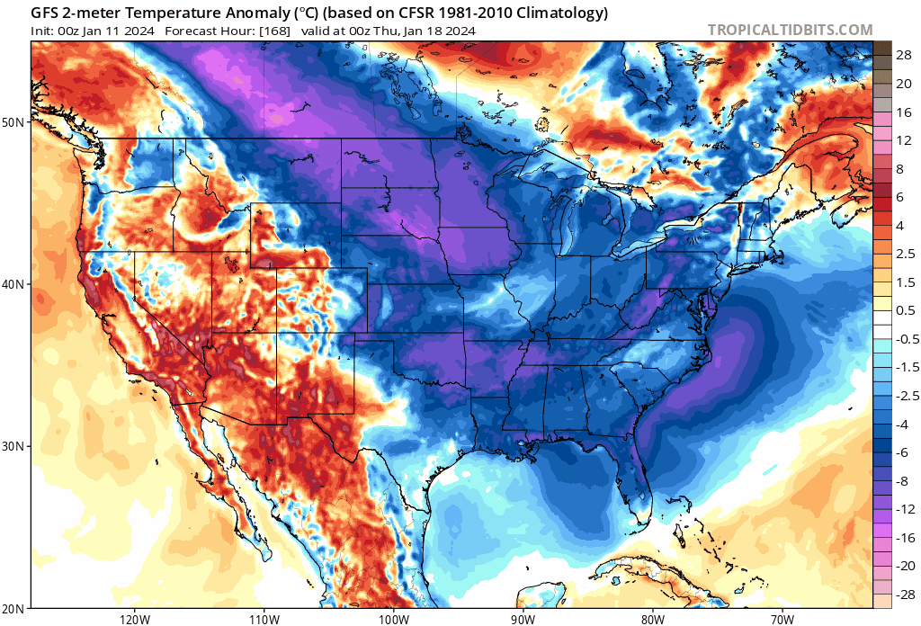 Speaking of the cold, the lowest temperatures up in Montana -so far- have run into the -40s (F), which equates to about 60F below normal. The Arctic blast will now slowly descend down the front range of the Rockies Friday and over the weekend.